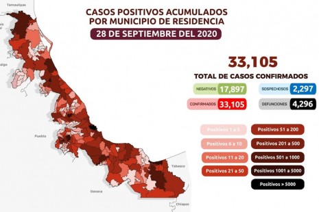 Veracruz acumula 33 mil 105 casos de Covid-19; hay 4 mil 296 fallecidos