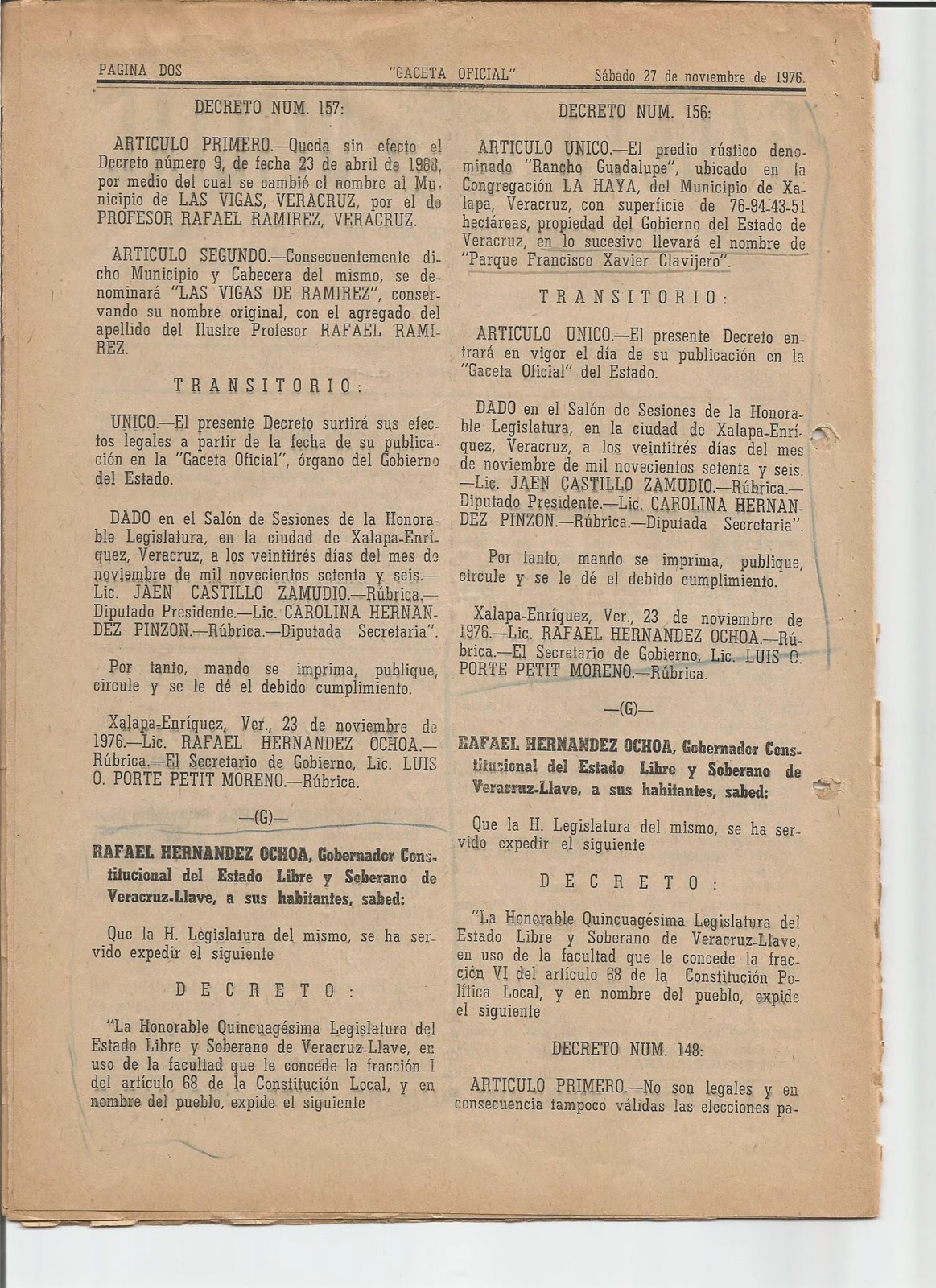 Posteriormente por el decreto número 156 promulgado por Hernández Ochoa el 23 de noviembre de 1976, el predio denominado “Rancho Guadalupe” cambia su nombre para llamarse “Parque Francisco Javier Clavijero”. Lo anterior se publicó en la Gaceta Oficial del Estado con fecha del sábado 27 de noviembre del mismo año.