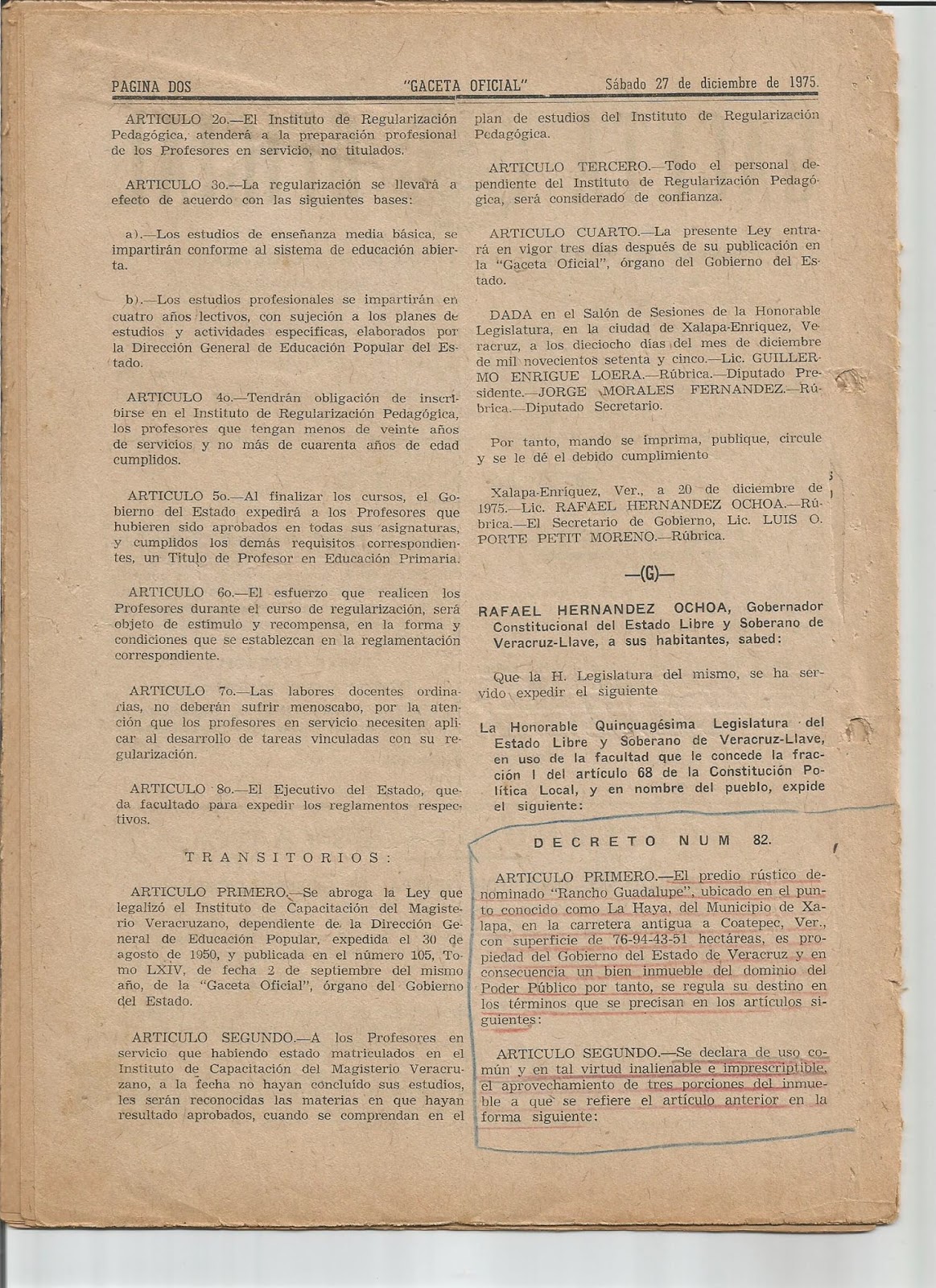 Dicho texto expresa claramente: “El predio rústico denominado “Rancho Guadalupe”, ubicado en el punto conocido como La Haya, del Municipio de Xalapa, en la carretera antigua a Coatepec, Ver., con superficie de 76-94-43-51, es propiedad del Gobierno del Estado de Veracruz y en consecuencia un bien inmueble del dominio del Poder Público por tanto, se regula su destino en los términos que se precisan en los artículos siguientes: ARTÍCULO SEGUNDO.- Se declara de uso común y en tal virtud INALIENABLE E IMPRESCRIPTIBLE, el aprovechamiento de tres porciones del inmueble a que se refiere el artículo anterior”.