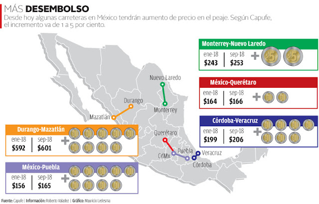 En cuanto a la carretera México-Querétaro, una de las más transitadas, el incremento se ubicó en 1.2 por ciento, para tener una tarifa final de 166 pesos. Respecto a la de Durango-Mazatlán, los automovilistas deberán desembolsar 601 pesos, lo que significa un aumento de 1.5 por ciento.