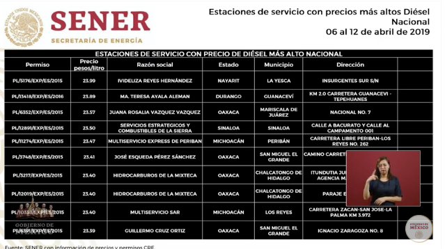 En su presentación, la funcionaria pública informó que Shell es la empresa que vende más caro el litro de gasolina: Regular en 20.23 pesos y Premium en 21.61 pesos.