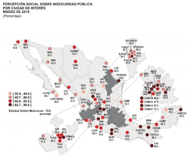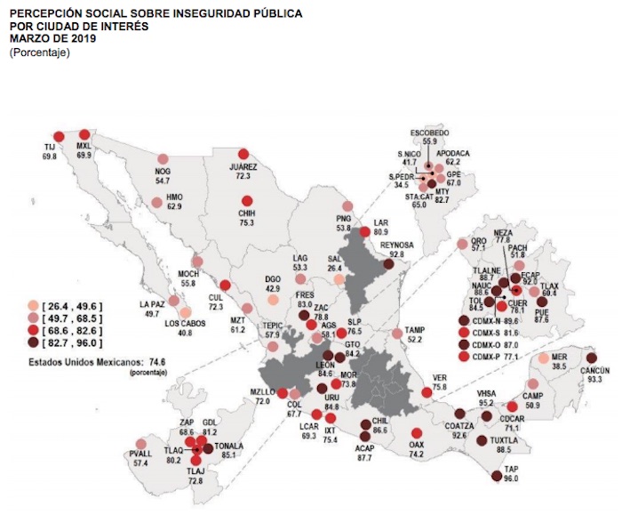 En contraparte, las ciudades con menor percepción de inseguridad fueron: Saltillo, Coahuila, con 26.4 por ciento; San Pedro Garza García, Nuevo León (34.5); Mérida, Yucatán (38.5); Los Cabos, Baja California (40.8); San Nicolás de los Garza, Nuevo León (41.7); y Durango, Durango (42.9).