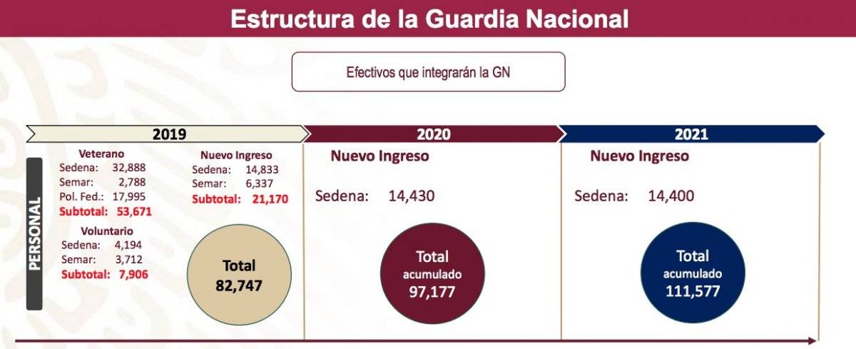 Este 2019, la Guardia Nacional contará con 51 mil 915 elementos de la Secretaría de la Defensa Nacional, 12 mil 837 de la Secretaría de Marina y 17 mil 995 miembros de la Policía Federal.