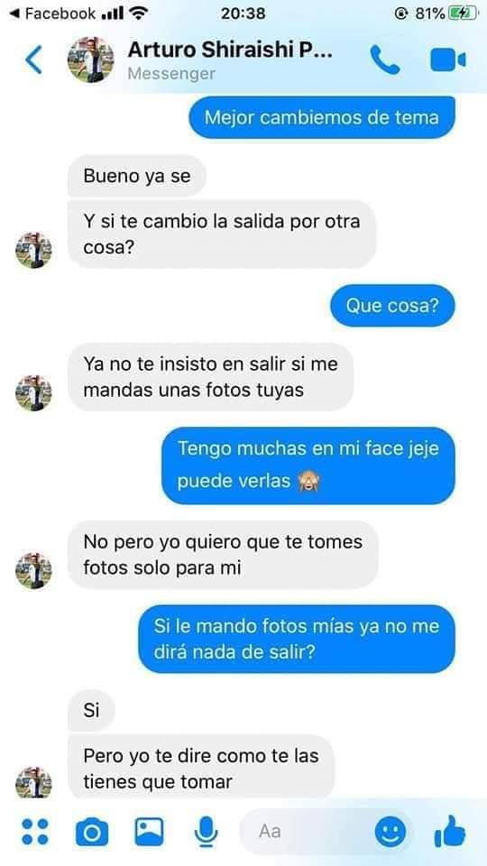 “Si te cambio la salida por otra cosa. Ya no te insisto en salir si me mandas unas fotos tuyas”, dice. A lo que la joven responde, “tengo muchas en mi Face, puede verlas”.
