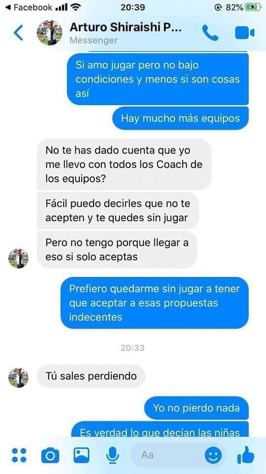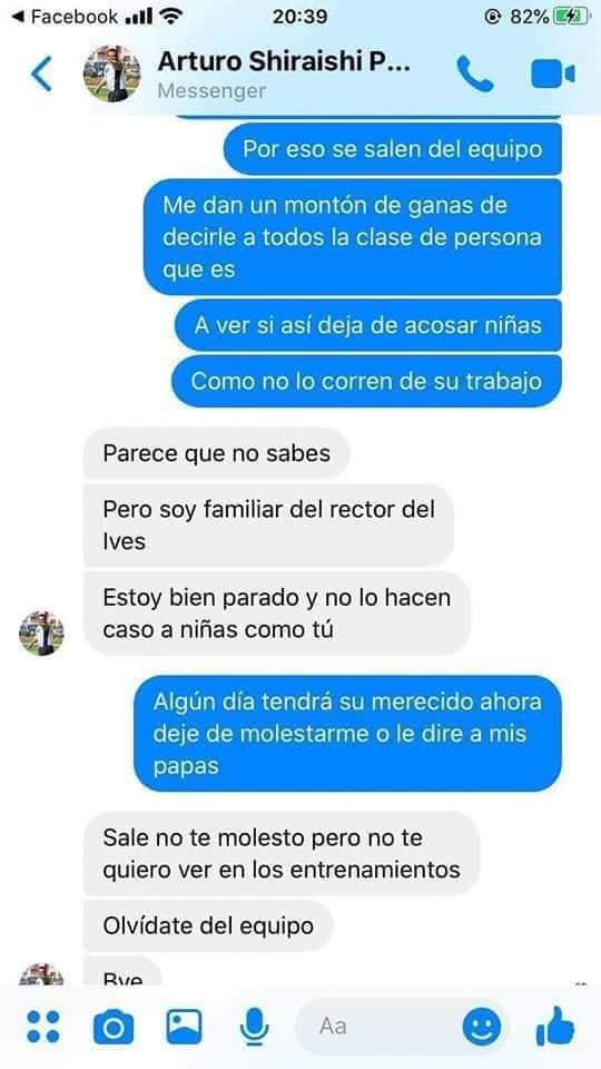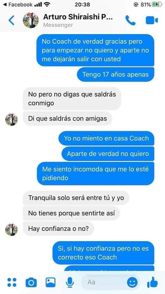La chica, de 17 años de edad, difundió la conversación de Facebook a través de que, el coach Arturo Shiraishi Ponce le pide que se tome fotografías sin ropa solo para él.