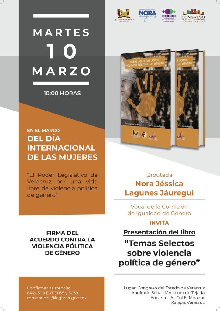 Para ello, el martes 10 de marzo a las 10 de la mañana la Diputada Nora Jéssica Lagunes Jáuregui, Vocal de la Comisión para la Igualdad convoca a la presentación del libro “Temas selectos sobre violencia política de género” editado por la Universidad de Xalapa del que es coautora, junto con la Doctora Mónica Mendoza Madrigal y un grupo de expertas en la materia, todas signantes de los textos que integran esta obra colectiva.