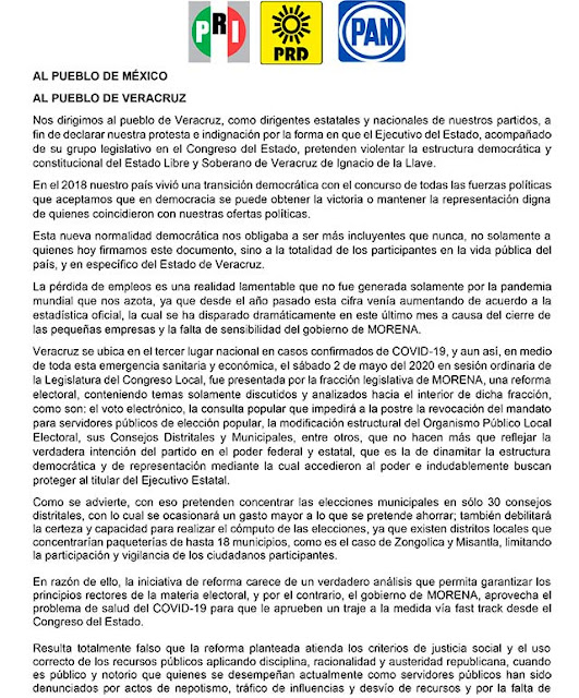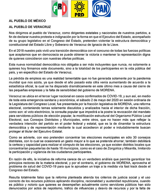 En un desplegado, dirigentes nacionales del PRD, Ángel Ávila Romero; del PAN, Marko Cortés Mendoza; y del PRI, Alejandro Moreno Cárdenas, así como los del Estado, Jesús Alberto Velázquez Flores, Joaquín Rosendo Guzmán Avilés y Marlon Ramírez Marín, respectivamente, anunciaron que con esta acción constituirán un bloque opositor por Veracruz.