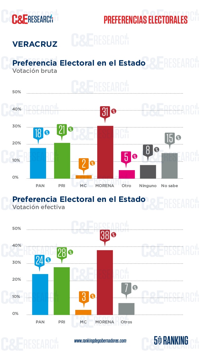 En cuanto a la preferencia electoral en Veracruz, MORENA cuenta con una amplia ventaja sobre el PRI y el PAN, los dos partidos que siguen más de cerca al partido líder, con una ventaja de 10 puntos sobre el primero y 13 sobre el segundo, ya que MORENA cuenta con una preferencia de voto bruto de 31% contra 21% del PRI y 18% del PAN.