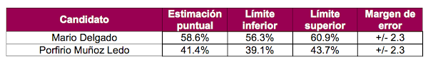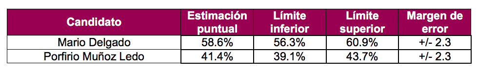 El intervalo de confianza entre el primero y segundo lugar en la encuesta es de 12 puntos porcentuales, lo que coloca a Mario Delgado con una clara ventaja, por arriba del candidato Porfirio Muñoz Ledo, como se muestra en la siguiente tabla :