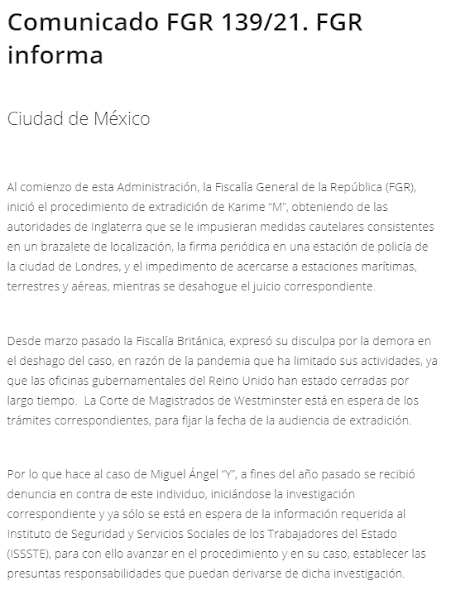 La FGR indicó que la Fiscalía de Reino Unido le externó sus disculpas debido a la demora en este procedimiento, pero indicó que el retraso se debe a la persistencia de la pandemia de COVID-19, lo cual aplazó el cronograma establecido para sus actividades.