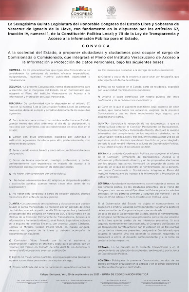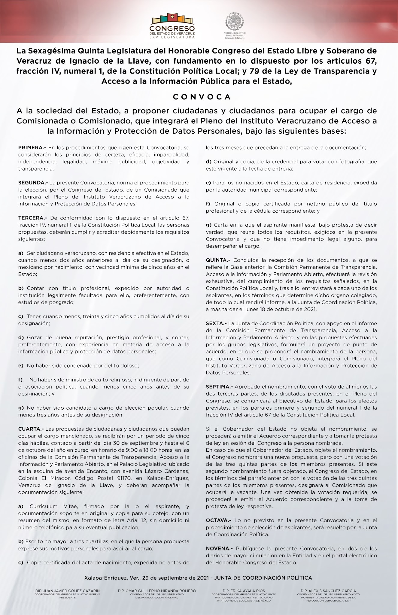 El Pleno de la LXV Legislatura aprobó el acuerdo de la Junta de Coordinación Política (Jucopo), por el cual se expide la convocatoria a la sociedad veracruzana, a fin de proponer ciudadanas y ciudadanos para ocupar el cargo de comisionado que integrará el Pleno del Instituto Veracruzano de Acceso a la Información y Protección de Datos Personales (IVAI), ante la conclusión en el cargo de la ciudadana María Magda Zayas Muñoz.