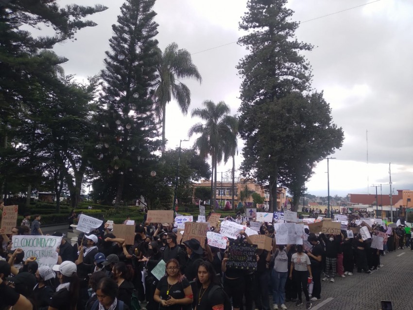 Vestidos de negro y algunos con pañuelos cubriéndoles el rostro la marcha fue encabezada por estudiantes de la facultad de derecho, manera pacífica y orden, marcharon del teatro del Estado sobre Ávla Camacho hasta llegar a plaza Lerdo, para concluir en Rectoría de la UV, gritando consignas contra el Rector Martín Aguilar y la gobernadora Roció Nahle.