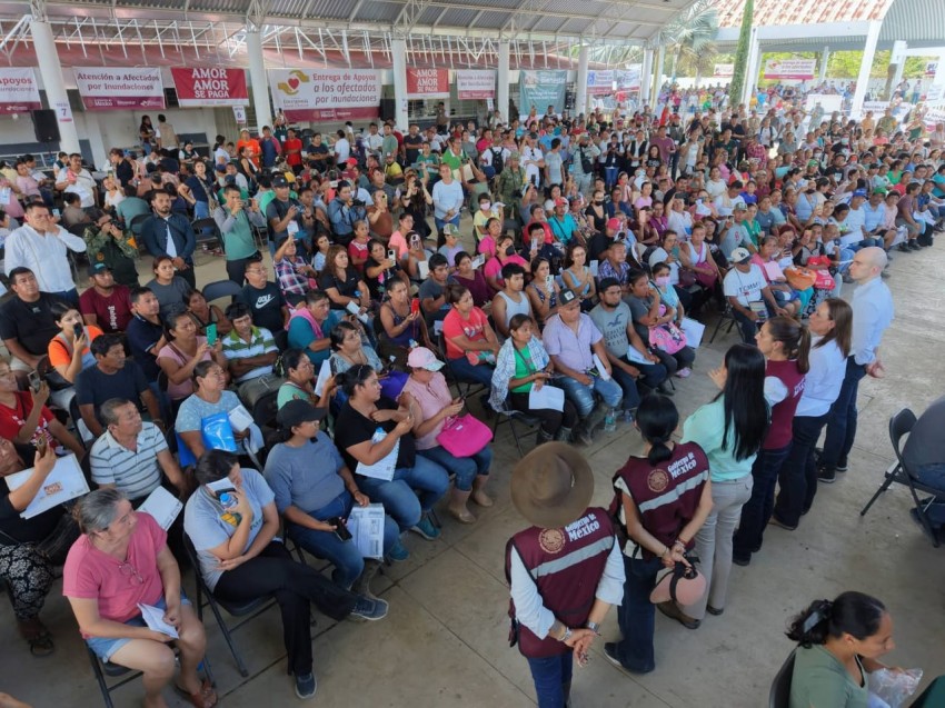 El encuentro tuvo lugar en las instalaciones del COBAEV número 5, habilitado como módulo de atención y entrega de apoyos a la población damnificada; a través de la Secretaría de Bienestar, se distribuyen los primeros apoyos económicos de 20 mil pesos, además de vales de despensa y paquetes de enseres domésticos.