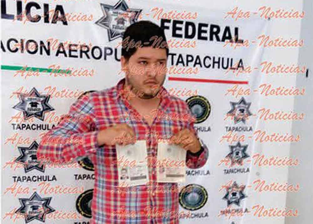Elementos de la Policía Federal detuvieron en el Aeropuerto Internacional de Tapachula a Mario Medina Garzón, al ser descubierto con identificaciones falsas del exgobernador de Veracruz, Javier Duarte de Ochoa.