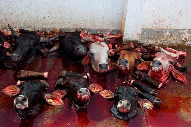 Sus miradas reflejan tristeza, angustia; algunos incluso perciben la muerte y agachan la cabeza; otros intentan escapar, pero no pueden, pues están en el matadero.