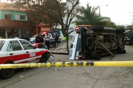 Vuelca patrulla de seguridad pública tras chocar contra taxi en Coatzacoalcos
