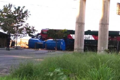 En Veracruz pipa cargada con gasolina intenta ganarle el paso al tren y lo arrastra