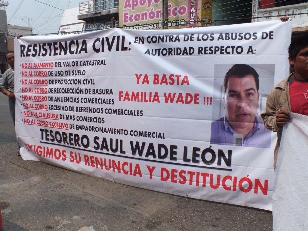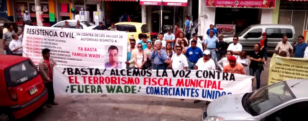 Comerciantes adheridos a diferentes organizaciones se manifestaron en contra del tesorero municipal, Saúl Wade León a quien acusan de terrorismo fiscal y de ser responsable del cierre de varios comercios y fuentes de empleo.