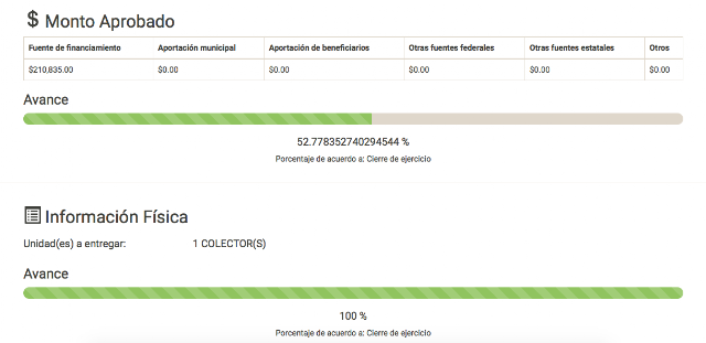 En el bloque denominado como monto aprobado efectivamente aparece un avance apenas superior al 50 por ciento, lo que establece que no se ha terminado de pagar la obra efectivamente; sin embargo en el renglón de avance físico de la obra, esta marca un cien por ciento.