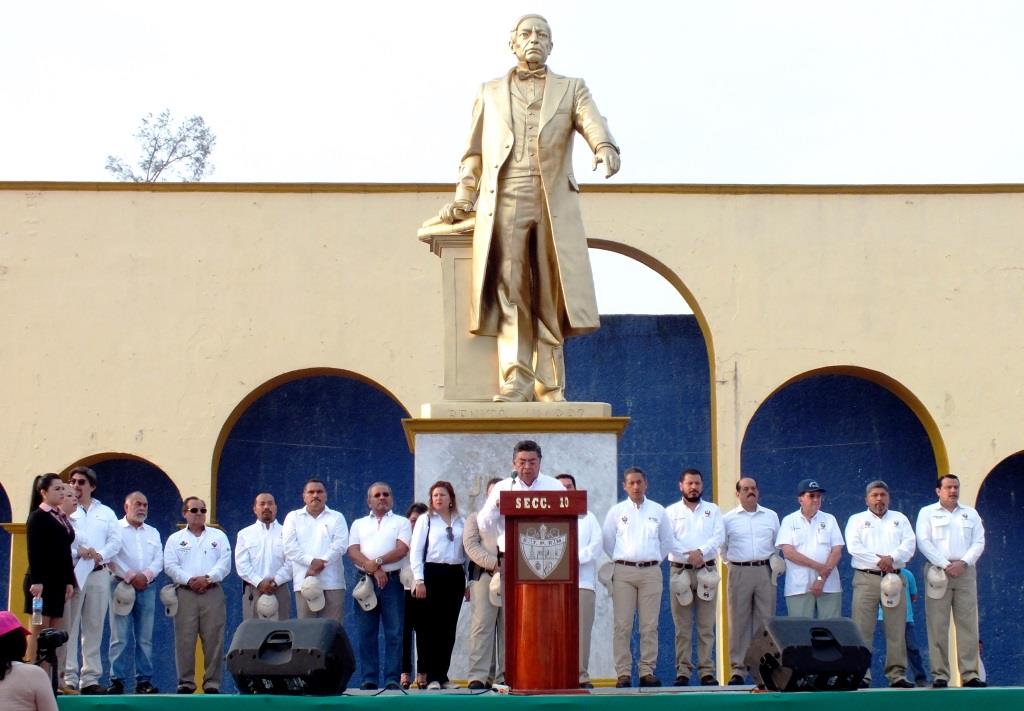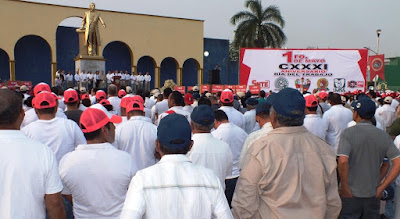 Asimismo dijo que, recordamos con gratitud a los Mártires de Chicago, a los Mártires de Cananea, a los de Río Blanco, se revelaron para exigir y lograr mejores condiciones de trabajo. Los últimos fueron inspiración para que en nuestra carta magna de 1917 quedaran plasmadas las conquistas que hoy disfrutamos los trabajadores de México. Asimismo rindieron tributo a los obreros de Minatitlán.