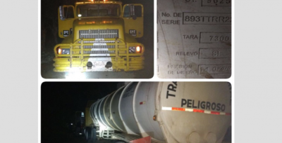 Allí se, en principio se detuvo a dos personas quienes viajaban en un vehículo tipo tractor, marca Dina, color amarillo, el cual llevaba acoplado a semirremolque tipo tanque con placas 392WR4 S.A.F.
