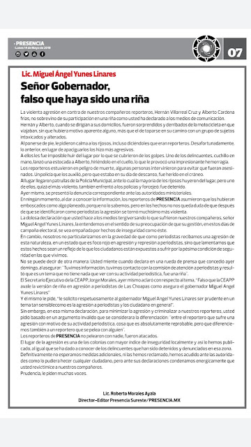 ​El director de Presencia Sureste y Presencia.MX, Roberto Morales Ayala, pidió al gobernador Miguel Ángel Yunes Linares que rectifique sus declaraciones con respecto a que los reporteros Alberto Cardona Frías y Hernán Villareal participaron en una riña durante la noche del sábado.