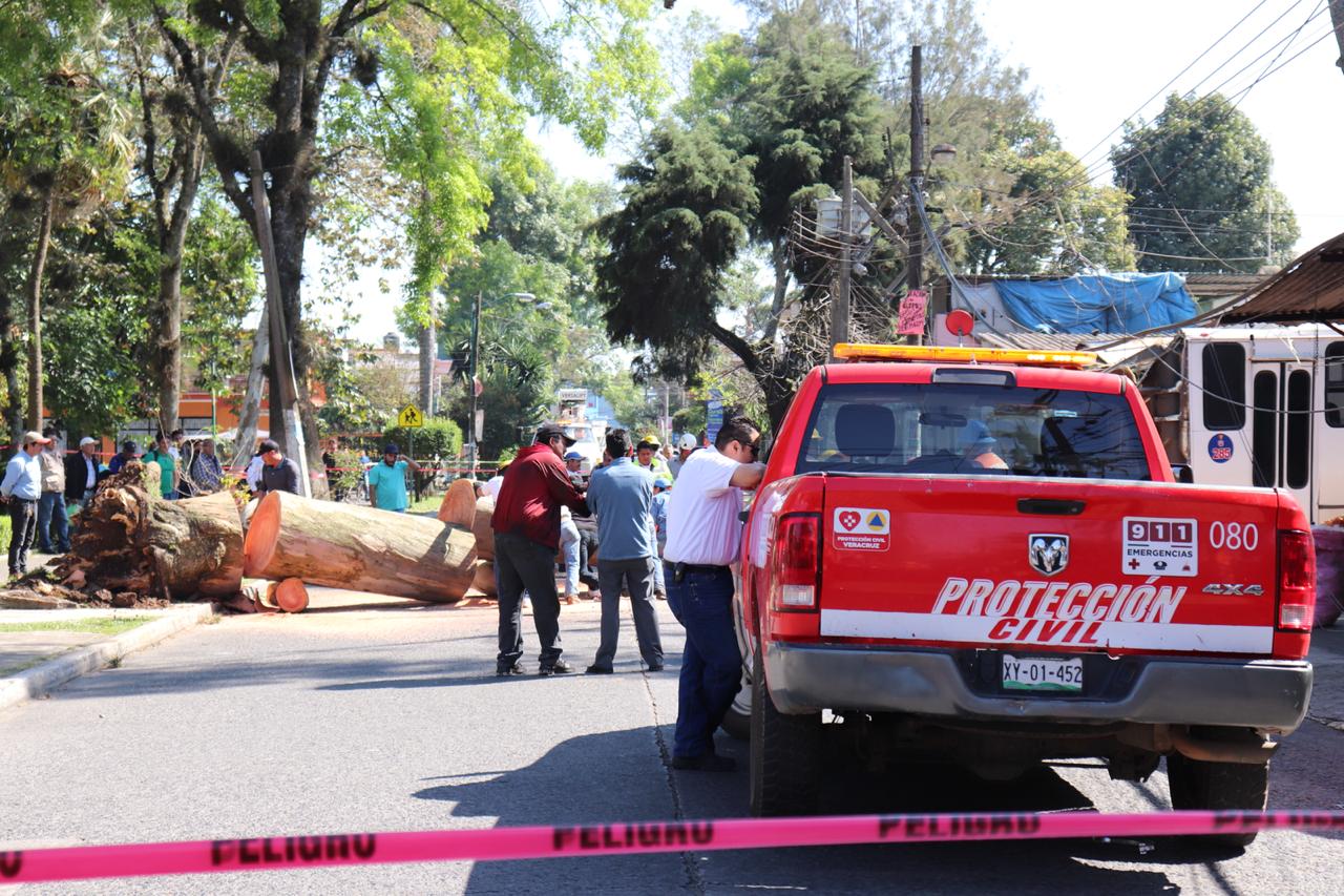 Personal de protección Civil municipal, tránsito del estado y Comisión Federal de Electricidad trabajan en el retiro del árbol.