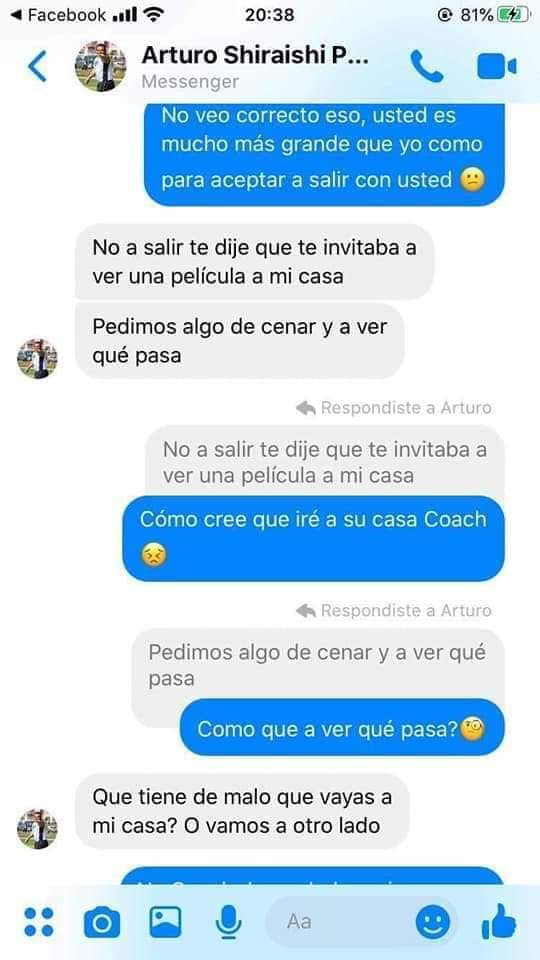 La chica, de 17 años de edad, difundió la conversación de Facebook a través de que, el coach Arturo Shiraishi Ponce le pide que se tome fotografías sin ropa solo para él.