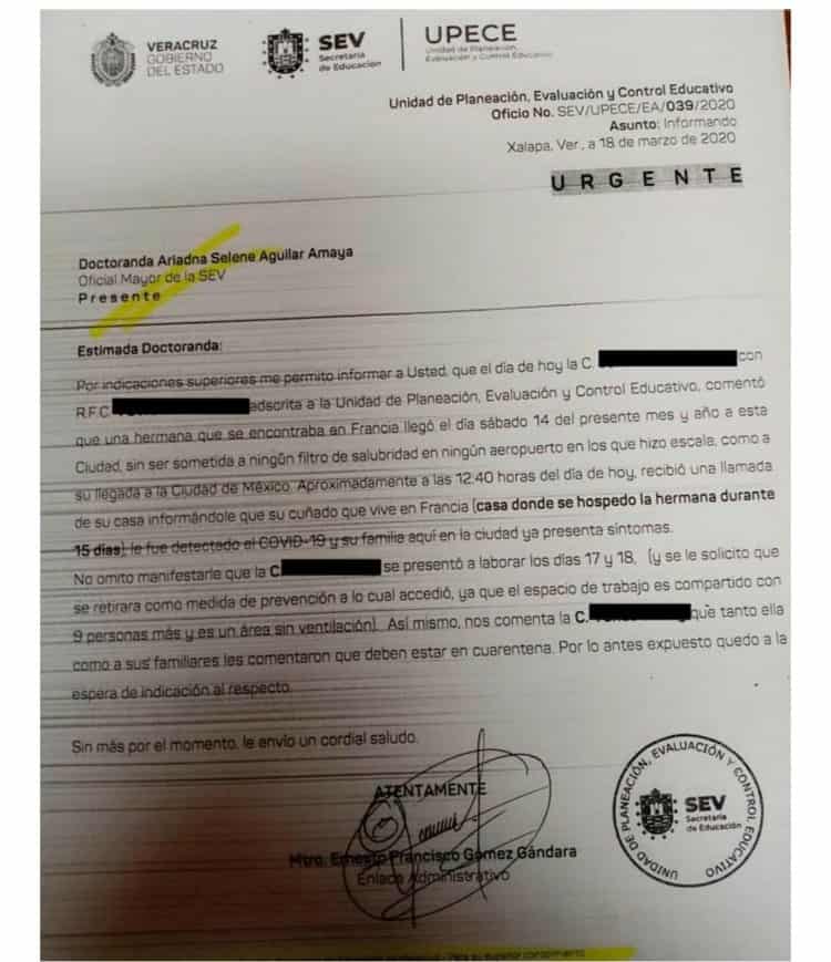 Mediante oficio SEV/UPECE/EA/039/2020, enviado con carácter de urgente, el enlace administrativo Ernesto Francisco Gómez Gándara, informó a la oficial mayor Ariadna Selene Aguilar Amaya, sobre el caso de una trabajadora que el pasado 14 de marzo recibió a su hermana, proveniente de Francia.