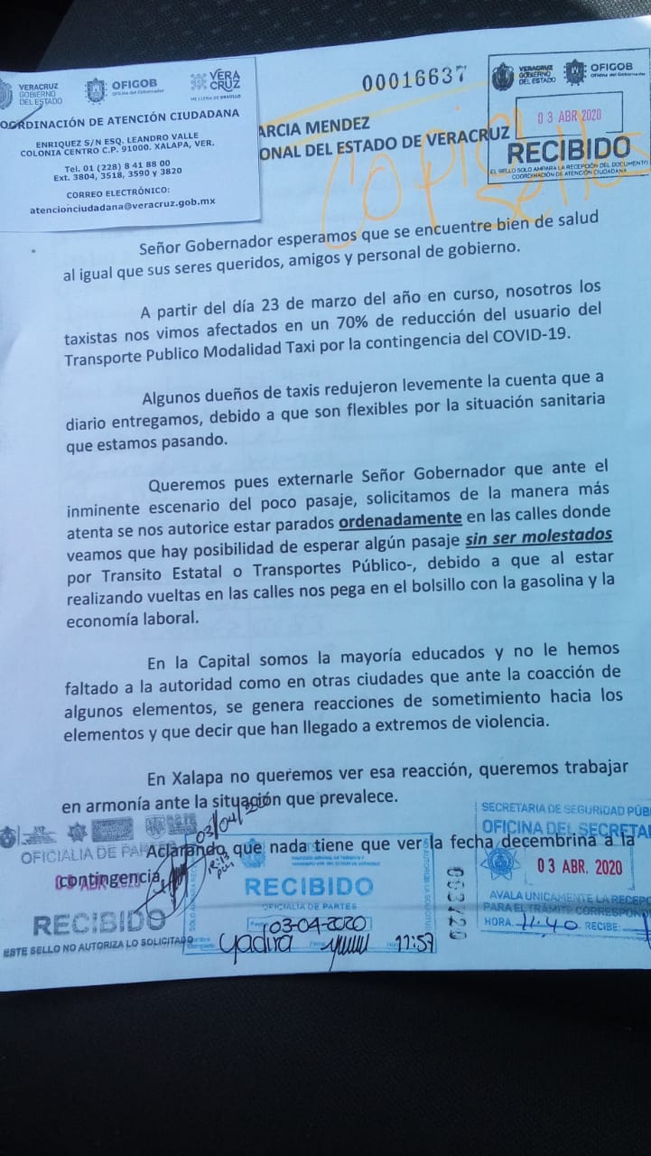 Taxistas independientes de la ciudad capital, integrados por 49 trabajadores del volante hicieron entrega de un oficio a las oficinas de Atención Ciudadana que depende del gobernador Cuitláhuac García Jiménez.