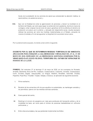 En dicho documento se establece que los municipios de Alvarado, Amatlán, Banderilla, Boca del Río, Coatepec, Coatzacoalcos, Coatzintla, Córdoba, Cosoleacaque, Fortín, Emiliano Zapata, Ixtaczoquitlán, La Antigua, Medellín, Minatitlán, Nanchital, Orizaba, Papantla, Poza Rica, Tihuatlán, Tuxpan, Xalapa y Veracruz deberán acatar estas disposiciones, por ser los puntos de mayor crecimiento en contagios de coronavirus.