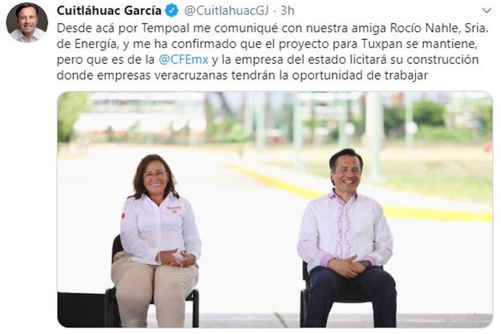 “Desde acá por Tempoal me comuniqué con nuestra amiga Rocío Nahle, Sria. de Energía, y me ha confirmado que el proyecto para Tuxpan se mantiene, pero que es de la CFE y la empresa del estado licitará su construcción donde empresas veracruzanas tendrán la oportunidad de trabajar”, escribió en su cuenta de Twitter.