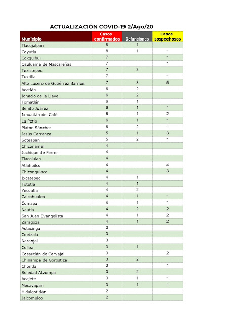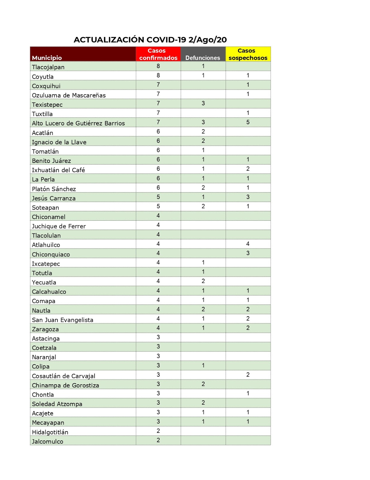 La secretaría de Salud del estado al corte de este sábado 1 de agosto, el municipio con más casos COVID-19 es Veracruz con 5,193, así como 675 defunciones y 505 sospechosos.