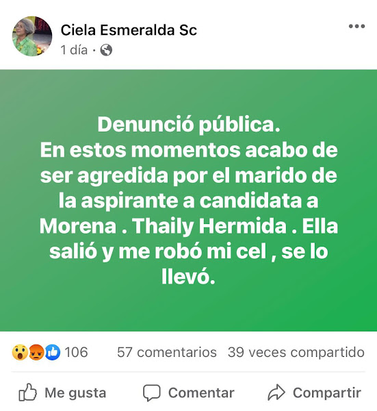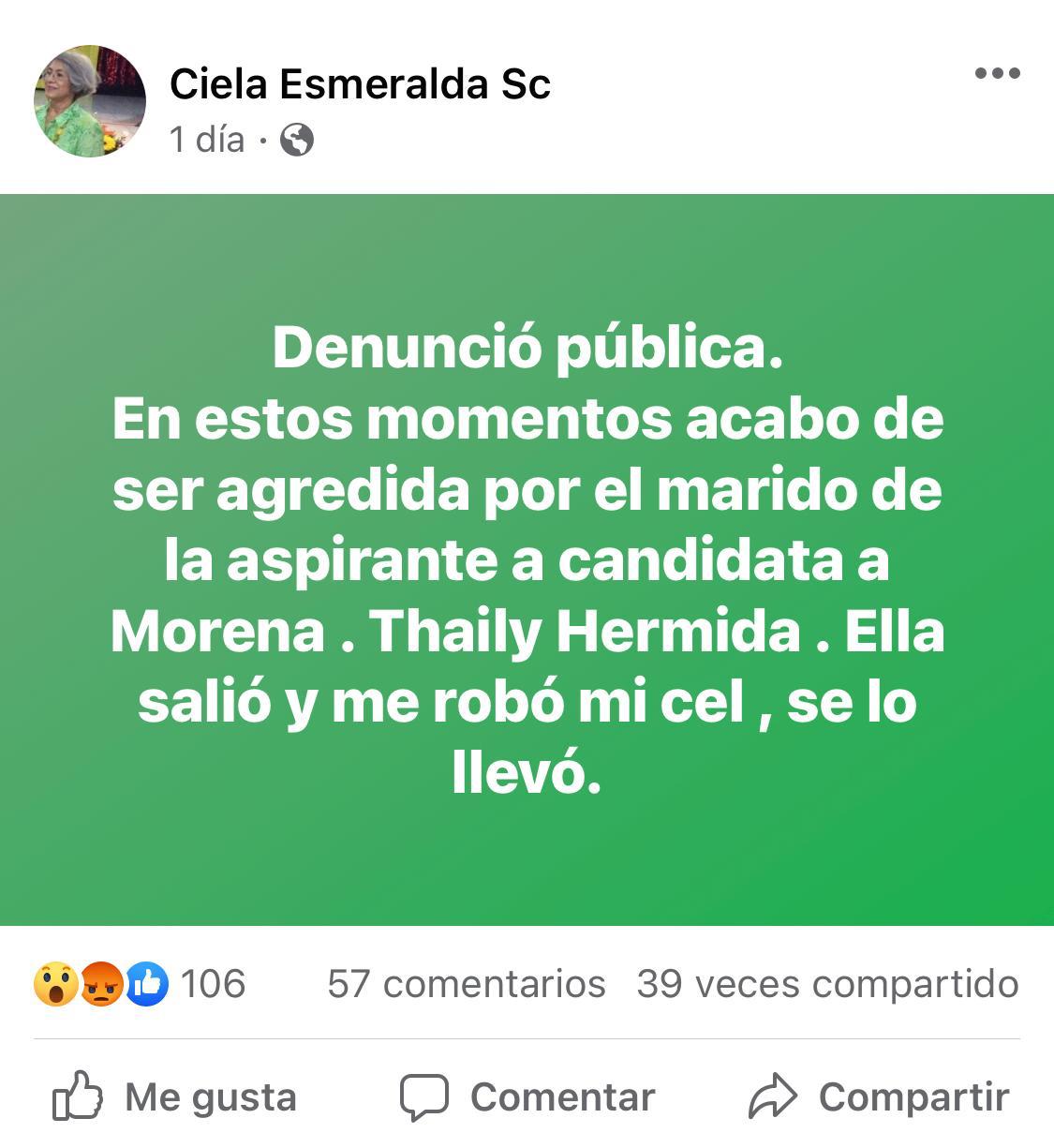 Acción por la cual de manera sorpresiva e intempestiva actuó con agresión el esposo de Thaili Hermida robando el celular de la presunta víctima y forcejeando físicamente a la profesora Ciela Esmeralda Sosa quién abiertamente denuncia estos hechos en la red social Facebook.