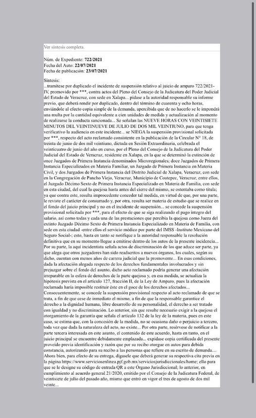 Parte de la suspensión concedida al amparo contra actos del Pleno del Consejo de la Judicatura del Poder Judicial del Estado de Veracruz con sede en Xalapa. Es contra la circular en que se determinó la extinción de 11 Juzgados de Primera Instancia Especializados en Materia Familiar Civil y dos Juzgados de Primera Instancia del Distrito Judicial de Xalapa, Veracruz, con sede en la Congregación de Pacho Viejo, Coatepec.