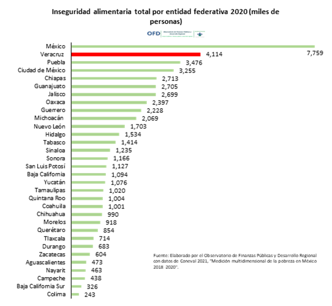 Este bajo nivel de ingreso ha llevado a gran parte de la población veracruzana a una situación de “inseguridad alimentaria”, lo cual significa que su “consumo alimentario está por debajo de los requerimientos necesarios o que padecen hambre de forma persistente durante periodos largos”, “porque no tienen acceso ni físico ni económico a suficientes alimentos inocuos y nutritivos para satisfacer sus necesidades alimenticias, a fin de llevar una vida activa y sana” (Coneval).