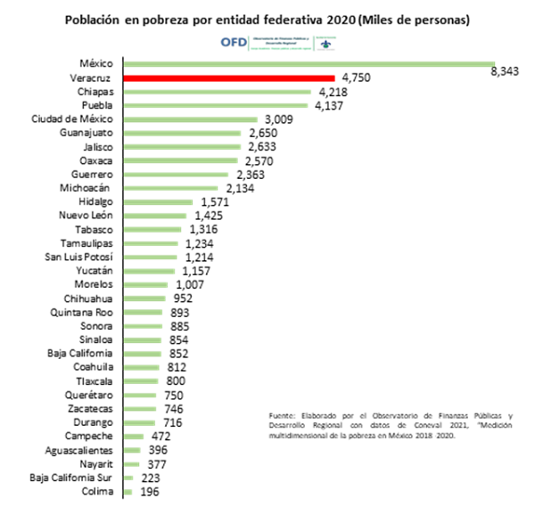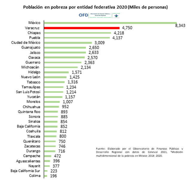 Esto significa que más de la mitad de la población del estado, el 58.6% se encuentra en esta adversa situación, lo que equivale a decir que seis de cada diez veracruzanos es pobre. Comparativamente, se observa que Veracruz supera en el número de pobres, a otros estados de gran pobreza como Chiapas con 4 millones 218 mil pobres, Oaxaca con 2 millones 570 mil y Guerrero con 2 millones 363 mil personas en pobreza, y que son estados que se distinguen por las enormes carencias que tiene gran parte de su población (Coneval 2021, “Medición multidimensional de la pobreza en México 2018 -2020”).