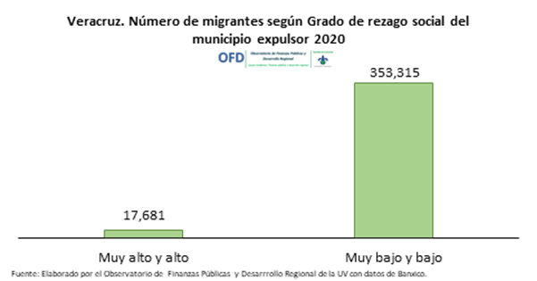 Es importante considerar que se trata de los municipios con el mayor nivel de desarrollo en el estado y cuyo “Grado de rezago social” es preponderantemente “muy bajo” o “bajo”, según la medición de CONEVAL. Esto significa que la migración no está relacionada necesariamente con la pobreza, es decir, que las personas se van al extranjero a buscar un empleo aun sin ser pobres, porque no encuentran oportunidades para mejorar su nivel de bienestar; y emigrar es una forma de evitar caer en la pobreza. Estos municipios son los que reciben más remesas y son los principales expulsores de mano de obra, ya que de ellos han emigrado un total de 353,315 personas, lo cual representa 79% de un total de 447,223 migrantes veracruzanos que radican en el extranjero y que envían remesas, lo cual significa que 6% de la población de estos municipios se ha ido al extranjero a buscar mejores oportunidades de vida. En cambio, hay sólo 35 municipios con grado de rezago social “alto” o “muy alto” que reciben remesas y han expulsado al extranjero apenas 17,681 personas, lo cual representa escasamente el 4% del total de migrantes, esto es apenas el 2.6% de su población.