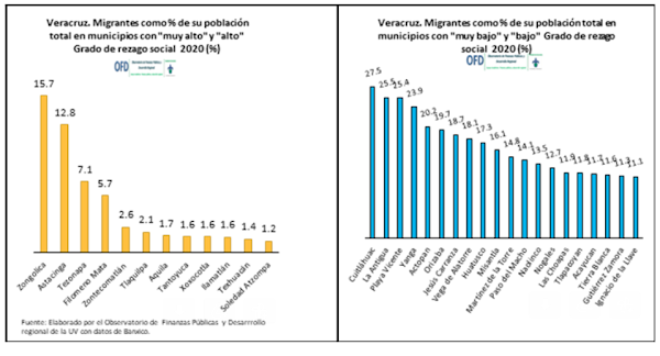 La importancia de la magnitud de los migrantes por municipio se observa de mejor manera al compararla con el tamaño de la población de cada uno de ellos, destacando, en el grupo de los municipios con grado de rezago social muy bajo y bajo la situación que, al menos, 20 de ellos han expulsado más del 10% de su población, destacando Cuitláhuac donde 27.5% de la población ha migrado al extranjero, La Antigua 25.5%, Playa Vicente 25.4%, Yanga 23.9%, Actopan 20.2%, Orizaba 19.7%, Jesús Carranza 18.7% y Vega de Alatorre con 18.1%. Lo mismo sucede, aunque en menor medida, en los municipios con muy alto y alto rezago social, donde destacan los casos de Zongolica, donde 15.7% de su población ha migrado al extranjero, Astacinga donde los migrantes representan el 12.8% de su población, Tezonapa con 7.1% y Filomeno Mata con 5.7%.