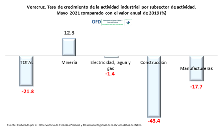 Veracruz se ubica actualmente en el último lugar a nivel nacional, por ser el Estado con mayor caída en la producción industrial durante la pandemia, con una variación porcentual de -21.3% en mayo de 2021 comparado con el valor observado en 2019. Y esto contrasta con el comportamiento de otros 11 estados, los cuales mostraron crecimiento en el mismo período, destacando Chiapas con un aumento de 29%, Nayarit con 18.9% y Oaxaca con 18.2%. Asimismo, se observa que otros 20 estados tuvieron decrecimiento productivo, pero no en la magnitud que presenta Veracruz, pues en 16 de estos, la reducción de la producción es, apenas, equivalente a la mitad o menos de la que registra la industria veracruzana.