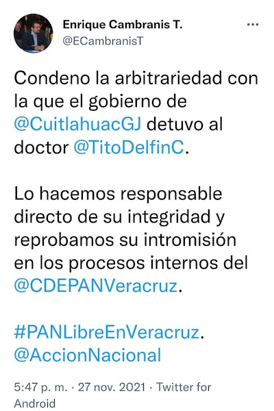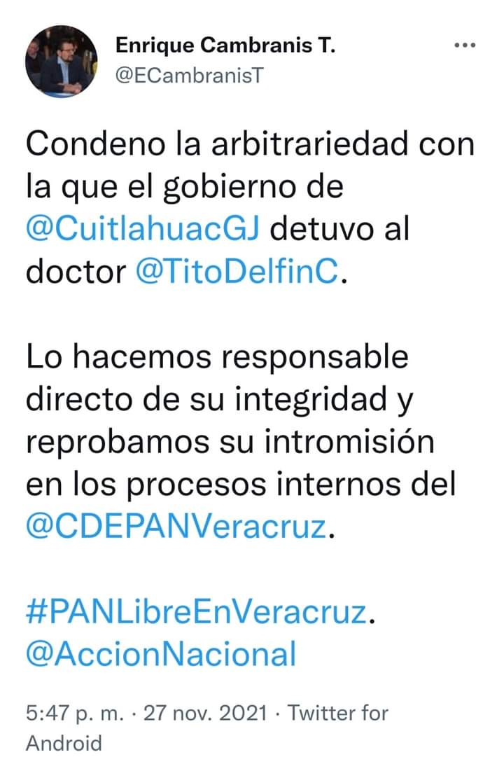 La tarde de este sábado, trascendió la detención de Tito Delfín Cano, aspirante a la dirigencia estatal del PAN en la zona norte.