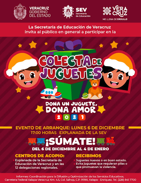 Como ya se ha hecho tradición, la Secretaría de Educación de Veracruz (SEV) hace extensiva la invitación a trabajadores y público en general a participar en la colecta “Dona un juguete, dona amor”, que iniciará formalmente el próximo lunes a las 17:00 horas con un evento en las instalaciones de la dependencia.