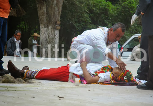 Perdiendo el equilibrio y cayendo ante el estupo de los presentes, que se encontraban en esos momentos en dichas instalaciones y que serían inauguradas como un nuevo atractivo más para la cabecera municipal, acudiendo en forma inmediata paramédicos de Protección Civil, que se encontraban para atender cualquier emergencia, solamente que momentos más tarde; todo esfuerzo fue inutil, ya que el danzante había muerto debido al brutal impacto.