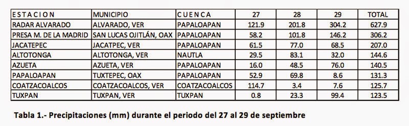 En la tabla 1 se muestran las lluvias máximas acumuladas en las últimas 72 horas, siendo la cuenca del río Papaloapan donde se tiene la mayor concentración de precipitaciones, y en donde la estación de radar de Alvarado hace una suma de 627.9 mm.