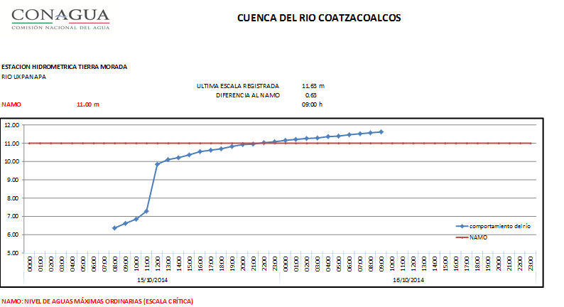 El nivel del río Uxpanapa, continúa en ascenso, a las 09:00 a.m. registró un nivel de 11.63 m, esto es 63 cm por arriba de su NAMO en la estación hidrométrica Tierra Morada, municipio de Las Choapas, Ver.