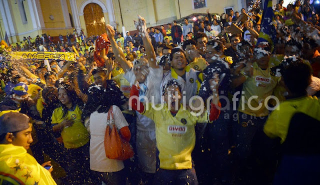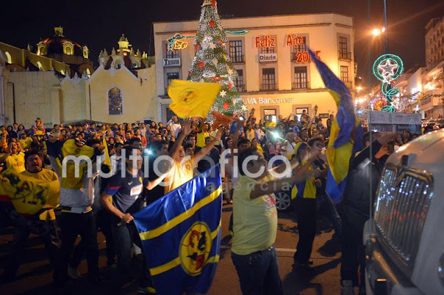 Aficionados americanistas celebraron en la calle Enriquez el triunfo de su equipo en la final del fútbol, quien ganara 3-1 a los Tigres de Nuevo León.