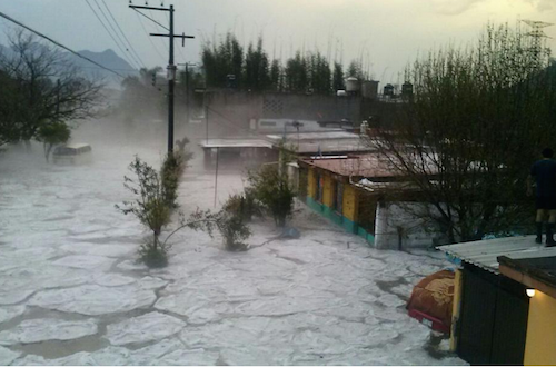 Por ello, elementos de la Policía Estatal y Fuerza Civil se trasladaron de inmediato hasta El Guayabal para iniciar las tareas de desazolve y remoción de bloques de hielo formados por el granizo compactado, los cuales alcanzaron hasta 25 centímetros de espesor.