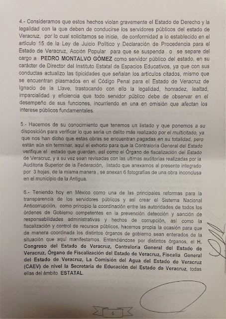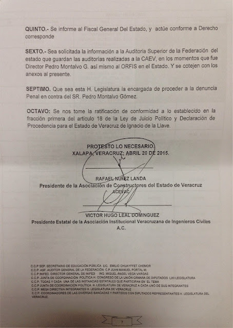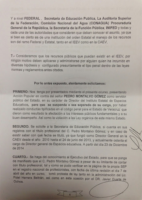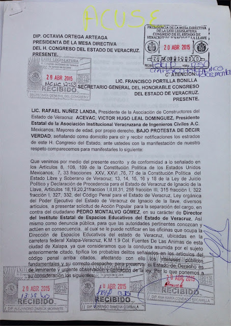 En oficio dirigido a la diputada Octavia Ortega Arteaga, presidenta de la Mesa Directiva del H. Congreso del Estado de Veracruz, así como al secretario general Francisco Portilla Bonilla —cuya copia fue enviada a varios medios de comunicación— los empresarios presentaron “solicitud de Acción Popular para la separación del cargo, en contra del ciudadano Pedro Montalvo Gómez, en su carácter de director del Instituto Estatal de Espacios Educativos del Estado de Veracruz (IEEV)”.