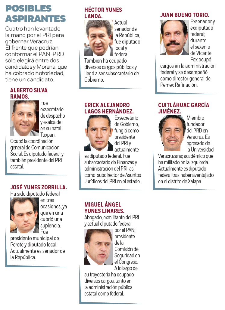 La inminente alianza entre PAN y PRD prevé que el candidato sea emanado del blanquiazul y baraja entre sus aspirantes a Miguel Ángel Yunes Linares y Juan Bueno Torio. Mientras que de Morena se prevé que el diputado federal Cuitláhuac García Jiménez sea su abanderado.